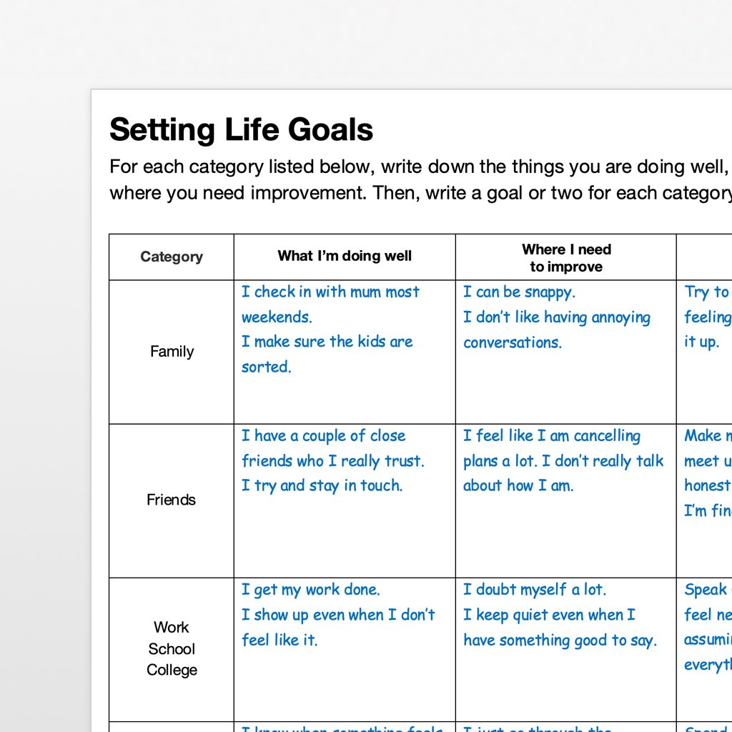 This worksheet is a simple way to take stock of different areas of your life. It can help you notice what feels okay, what feels difficult, and where you might want things to be different.