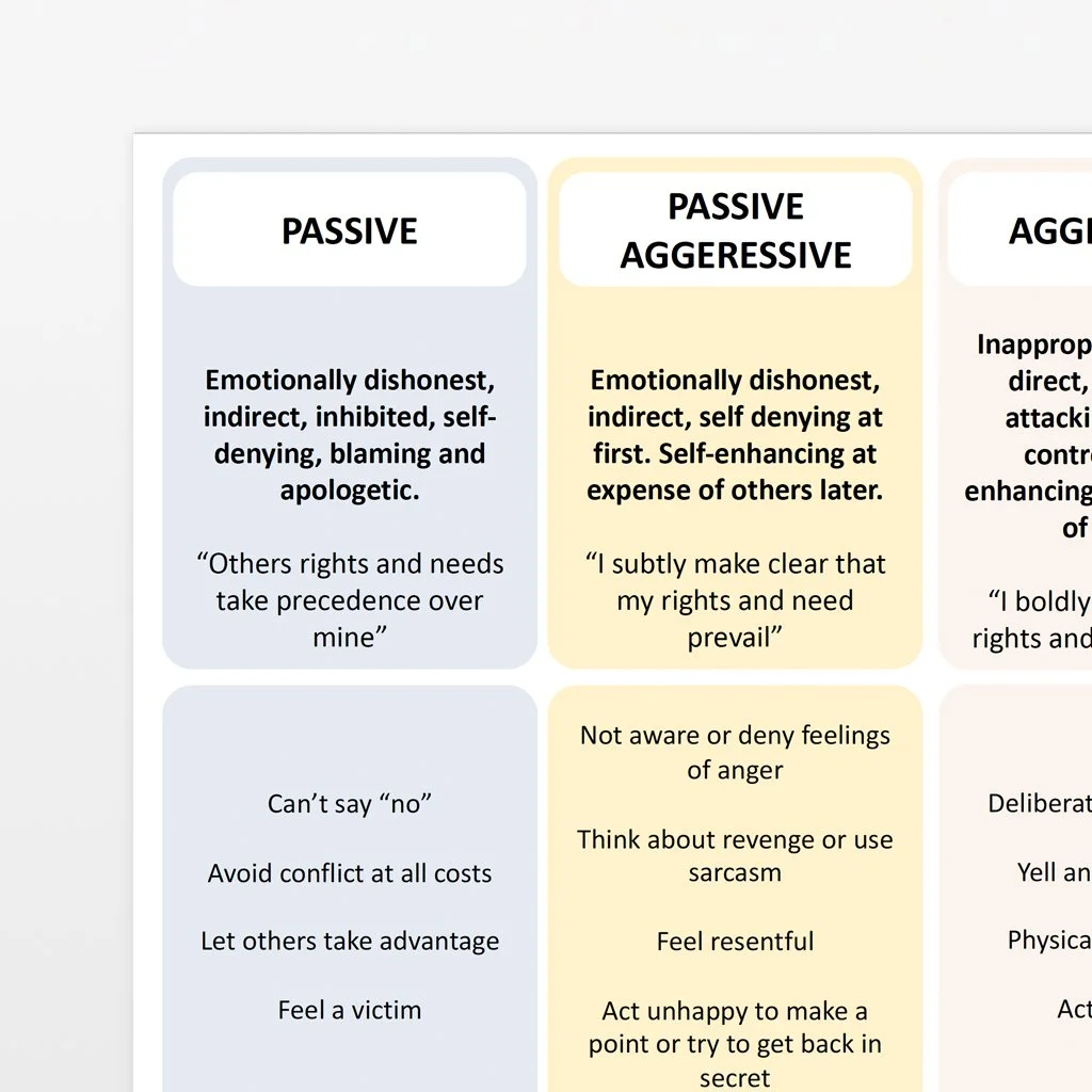 This handout looks at different ways interactions can play out, including passive, passive aggressive, aggressive, and assertive styles. These patterns can show up in relationships, at work, or in everyday situations, and are often influenced by the people involved and the context we are in.