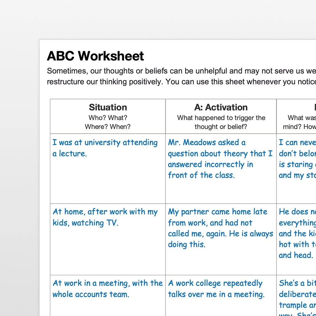 Using the ABC format can make anxious or unhelpful thinking patterns easier to notice, especially when reactions feel automatic or hard to explain. The focus is on understanding your experience more clearly, rather than trying to change it straight away.