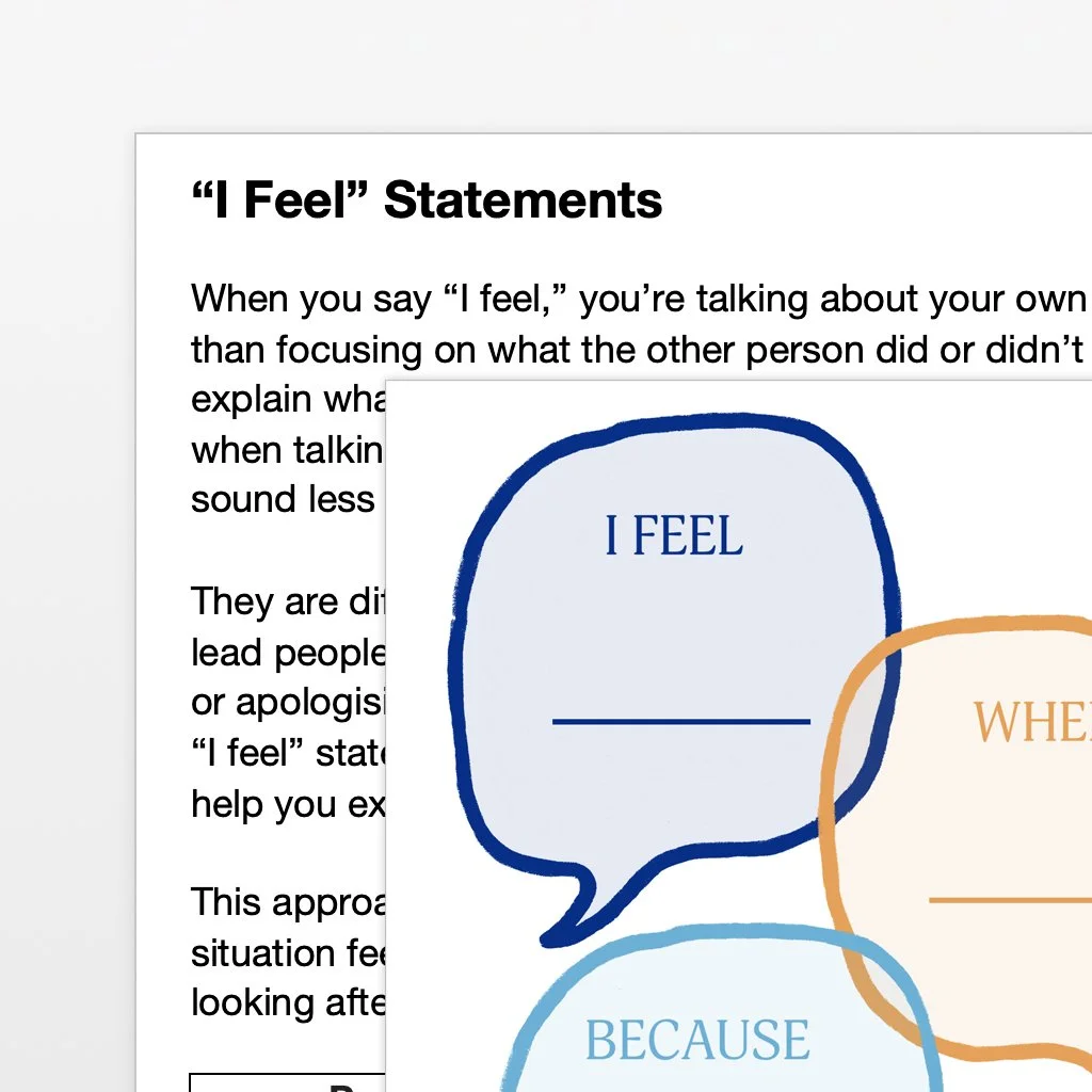 This worksheet offers a simple way to talk about feelings without blaming or escalating conflict. It focuses on describing your own experience, rather than what someone else has done wrong.