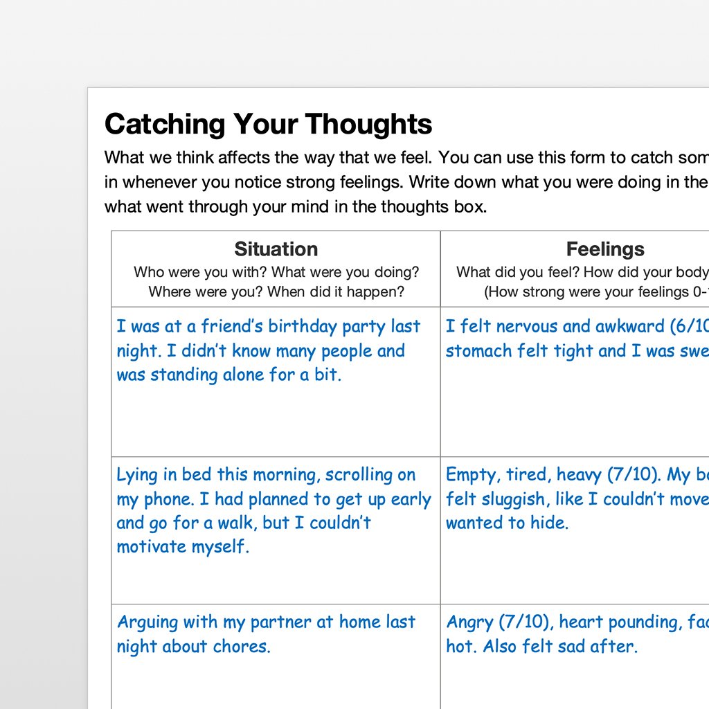 This worksheet helps you notice the thoughts that arise alongside strong emotions. By slowing things down and writing them out, it can become easier to see how situations, feelings, and thoughts are connected.